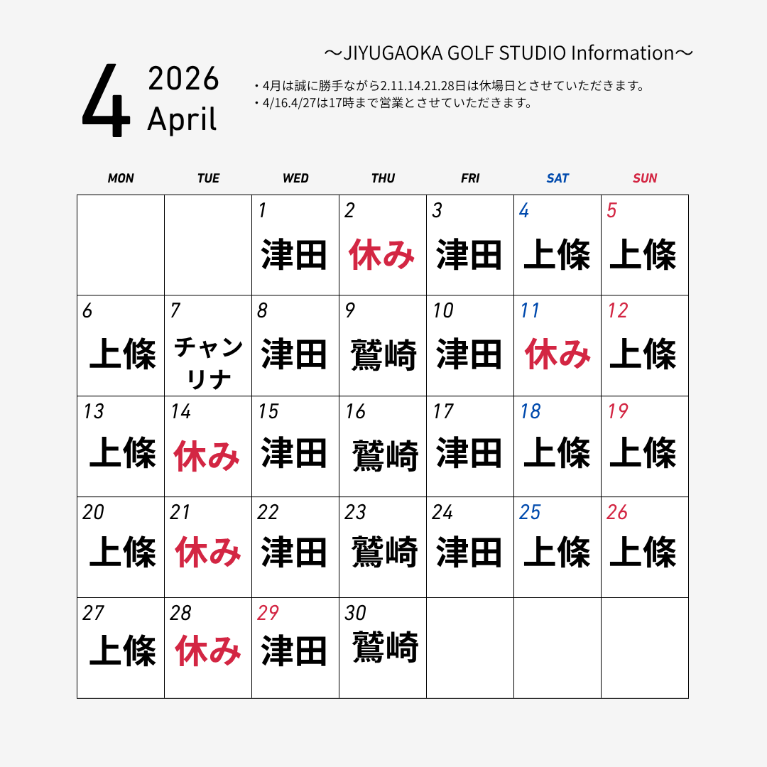 自由が丘ゴルフスタジオの4月のスケジュールを更新しました! 4月は誠に勝手ながら、2日・11日・14日・21日・28日は休場日とさせていただきます・ 4/7以降のチャンリナプロのレッスンは肘の手術のためしばらくの間お休みとさせていただき